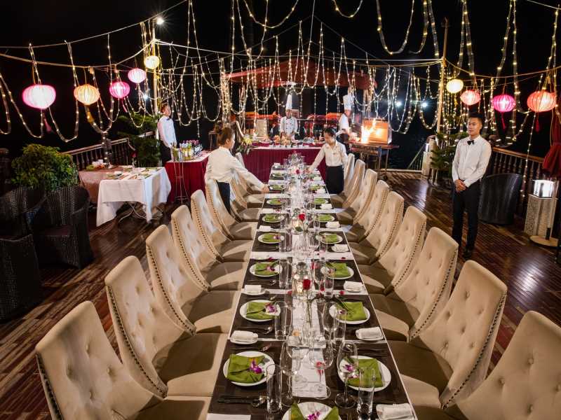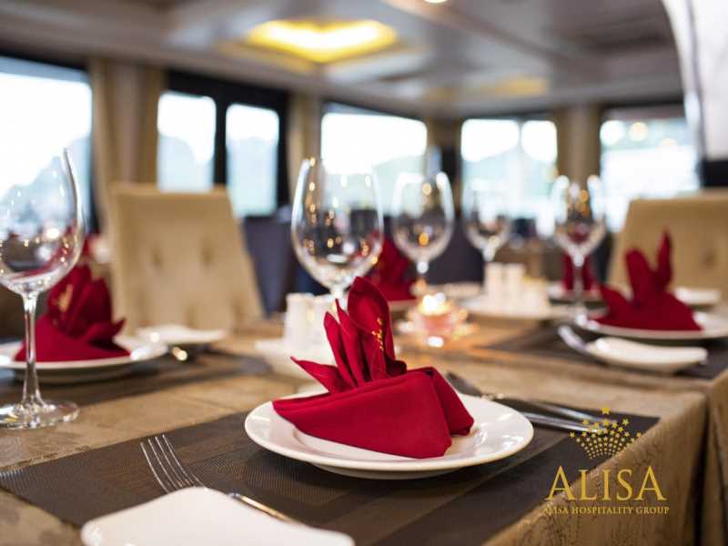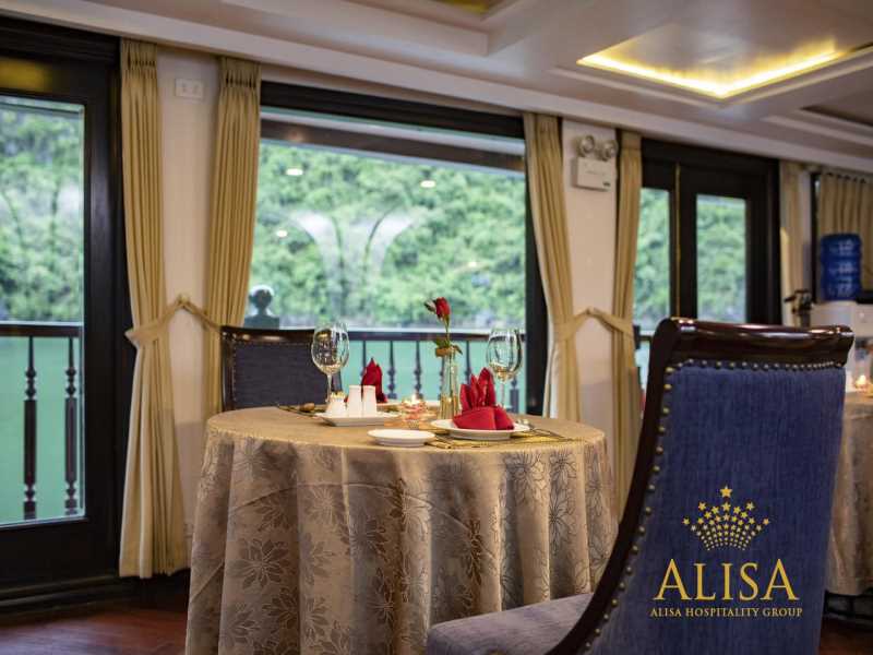 Alisa Cruise is a high-end vessel featuring a sophisticated neoclassical design, providing a luxurious retreat through the breathtaking landscapes of Halong Bay & Lan Ha Bay. Alisa Cruise offers premium facilities including an outdoor swimming pool, a fitness center, a professional spa, and 22 elegant cabins with private balconies and Jacuzzi tubs. During the 3D2N voyage, guests can explore the magnificent Sung Sot Cave, the poetic Trinh Nu Cave, the pristine Ba Trai Dao Beach, and enjoy panoramic views from Titop Island.