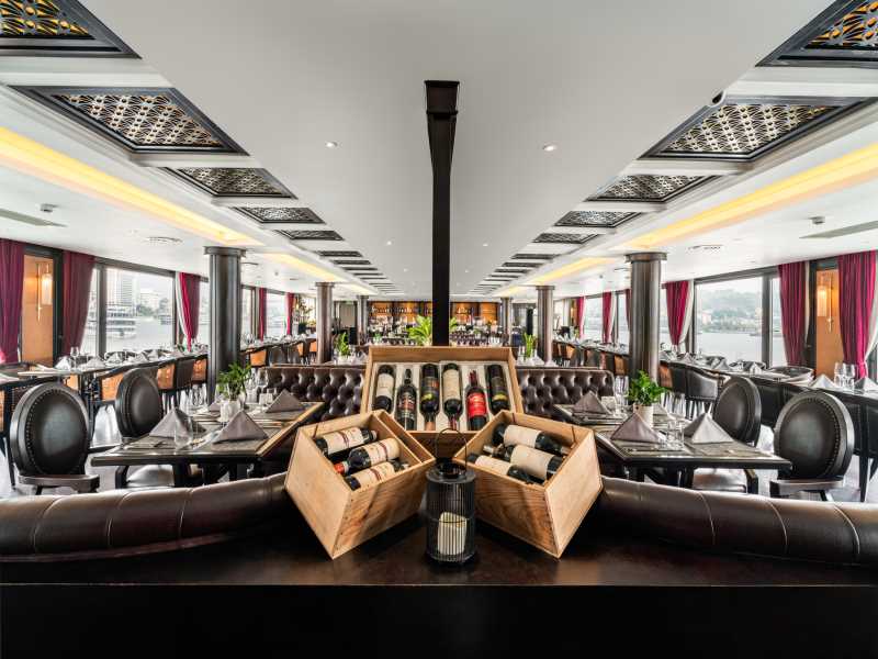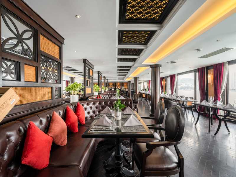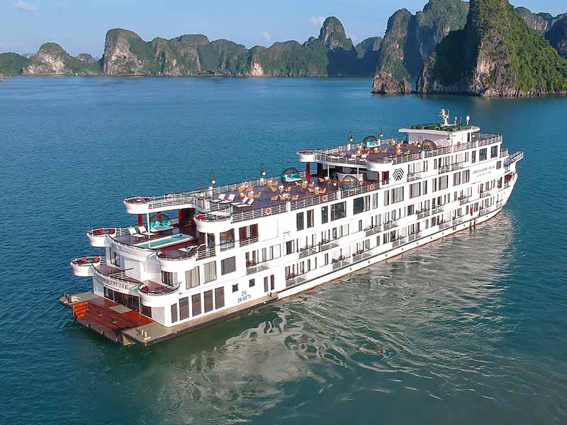 Ambassador Cruise I stands as a magnificent 5-star super-cruise, showcasing 45 opulent cabins designed with a sleek, modern elegance that brings a new level of luxury to Halong Bay. This premier vessel treats you to a world of indulgence, from its twin sundecks and outdoor Jacuzzi pool to the sophisticated Piano Lounge with live music. Your 2D1N voyage is a journey through the bay's most iconic wonders, featuring the spectacular Sung Sot Cave, the panoramic views of Titop Island, and a scenic kayaking experience at Luon Cave.