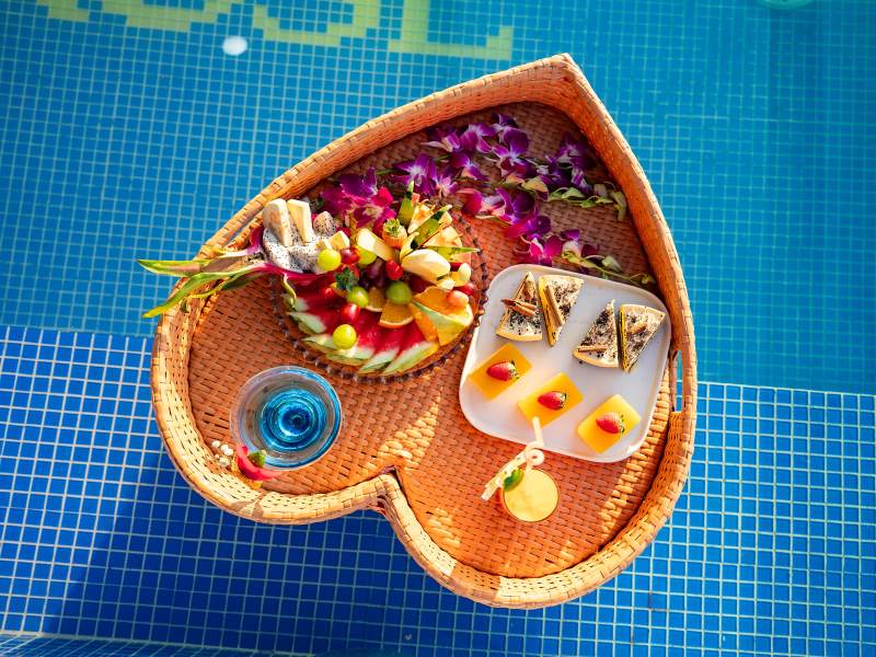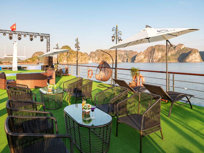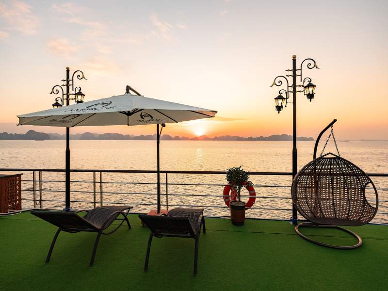 16:30 After that, you will get back to the cruise and be ready for our Sunset Party. Vietnamese tea, cake, fresh fruits, and snacks will be served when you're relaxing on the sundeck or in the infinity pool. The cruise will pass by the islands of Ha Long Bay on the way back.