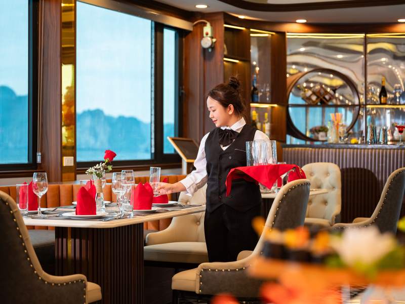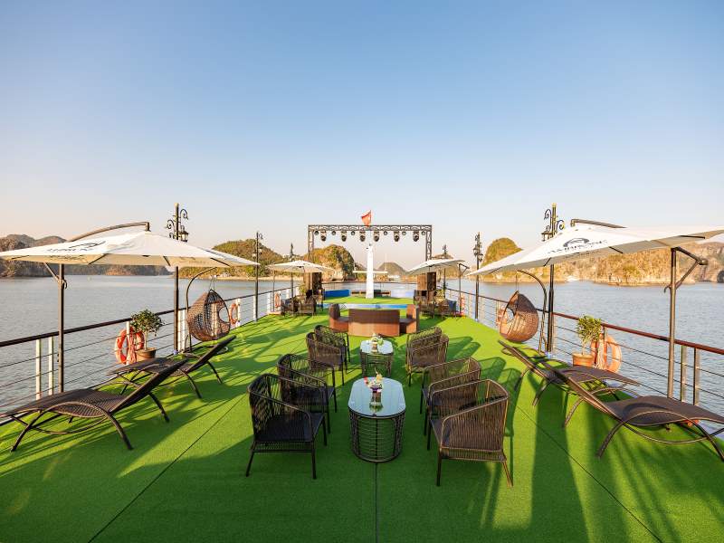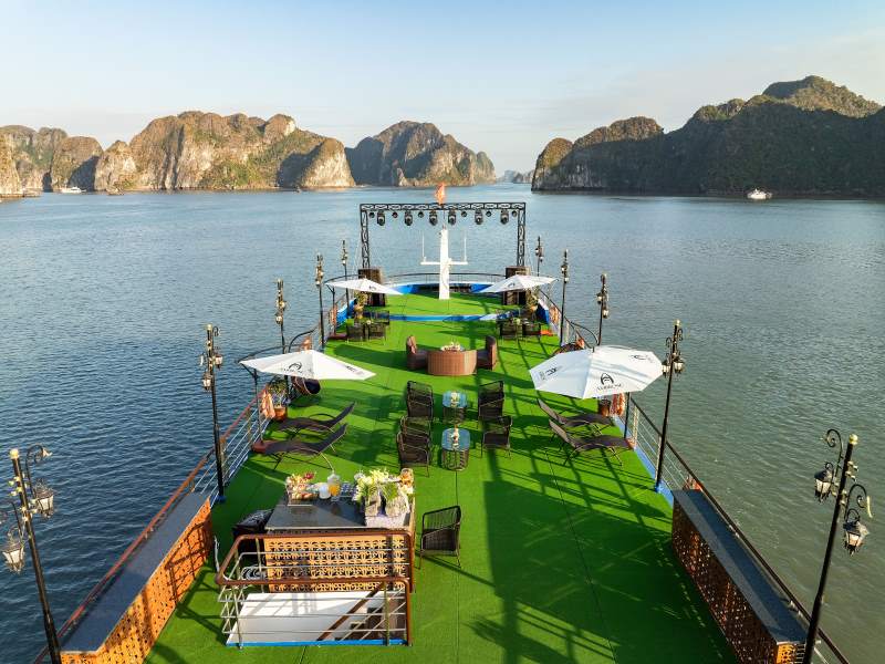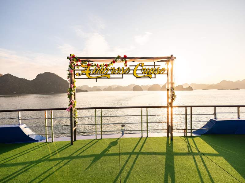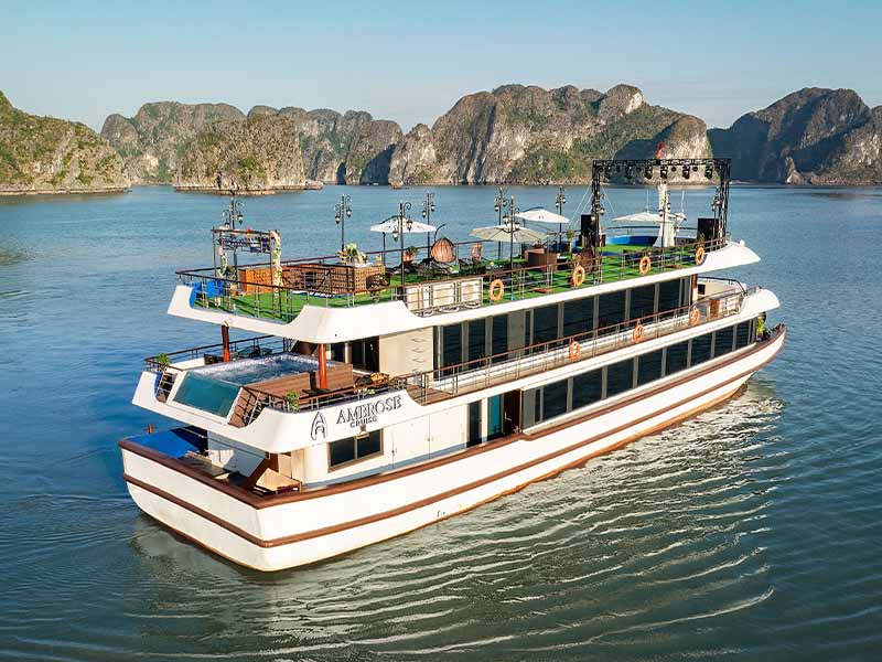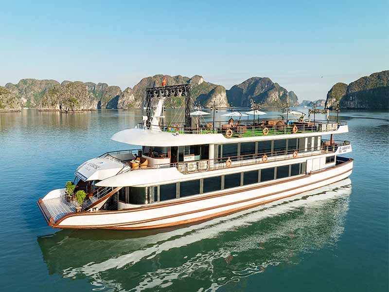 Ambrose Cruise is an elite 5-star vessel launched in 2025, featuring a modern and sophisticated design that offers a premier journey through Halong Bay. The ship is equipped with luxury amenities, including a mini pool jacuzzi, two refined restaurants, and performance stages for live music. Guests will experience a high-end 7.5-hour itinerary visiting iconic landmarks such as Sung Sot Cave, Luon Cave, and Titop Island, complemented by a vibrant sunset party on the spacious sundeck.