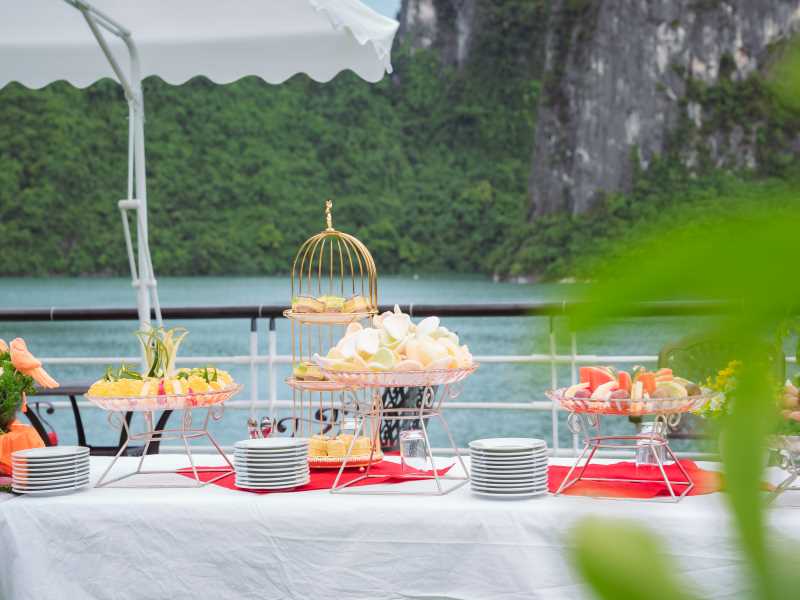12:30: Enjoy Vietnamese lunch on the boat. While having lunch, the boat will pass by the beautiful scenery on both sides with thousands of limestoneformations such as Fighting Chicken and Incense Burner Islets – 2 symbols of Halong Bay
