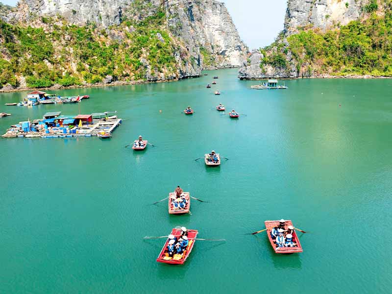 08.00 Riding on the rowing bamboo boat (rowed by the fisherman) to explore the Vung Vieng fishing village and learn about the local fishing life