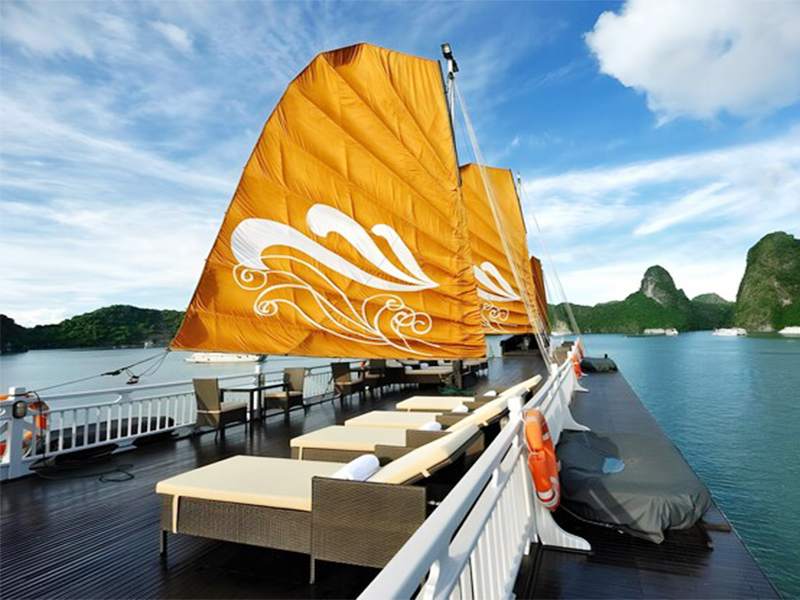 17.00 Head back to the Garden Peak Cruise for a shower and refreshments, then enjoy Happy Hour from 17:00 to 19:15 on the sundeck, including a canapé party, hightea and taking photo with Traditional Vietnamese Costumes.