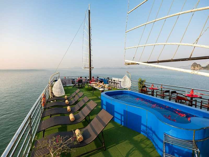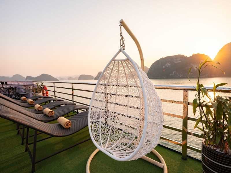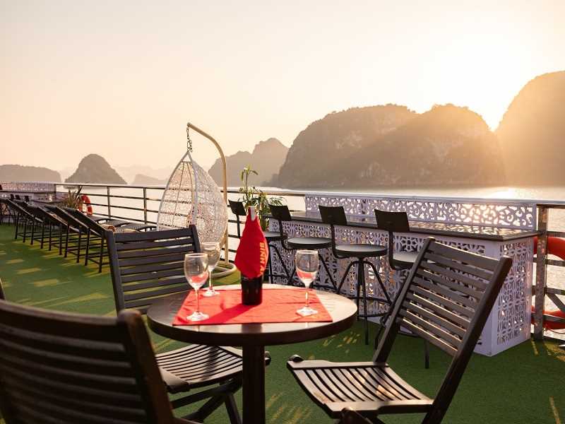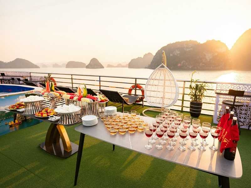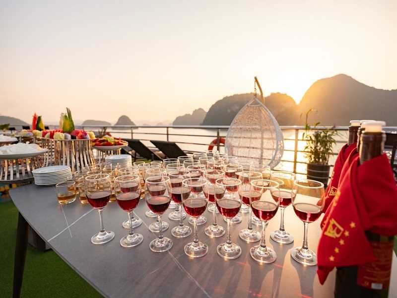 17h30: Cruising back to Halong International Cruise Port. There is a lot of time for enjoying a sunset party with tea, cakes, sunbathing on the upper deck with music, and enjoyingthe great fun of group touring fellows among the world's iconic natural scenery.