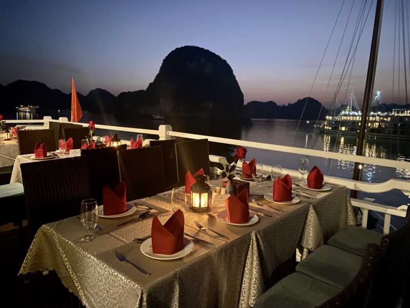 19:00 - 20:00 Enjoy your dinner on the Sundeck (if the weather is favorable). After dinner, you will enjoy a peaceful view of the Bay at night on the deck. Enjoying music and some drinks at Sky Bar while admiring the breathtaking view of the Bay at night, or squid fishing. The cruise ship anchors for your peaceful night stay in a quiet area.