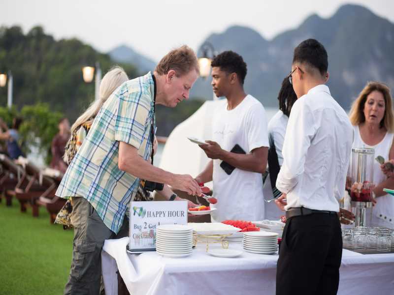 Joining us for a cooking demonstration to learn how to make one of the most famous Vietnamese cuisines, the spring rolls. Or reach the top deck of the cruise, where the guests can admire the magnificent sunset over the Gulf of Tonkin. Enjoy a Happy Hour time - BUY ONE GET ONE FREE at the bar. It is an ideal time for photography enthusiasts to capture the greatest moment of sunset over Lan Ha Bay.
