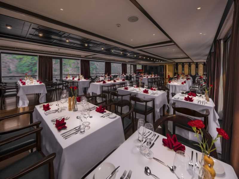 13:00: A splendid lunch is served at Tahiti Restaurant while the cruise travels across primitive Lan Ha Bay. The bay has hundreds of islands and islets, making it a wonderful background for guests to look at while dining.