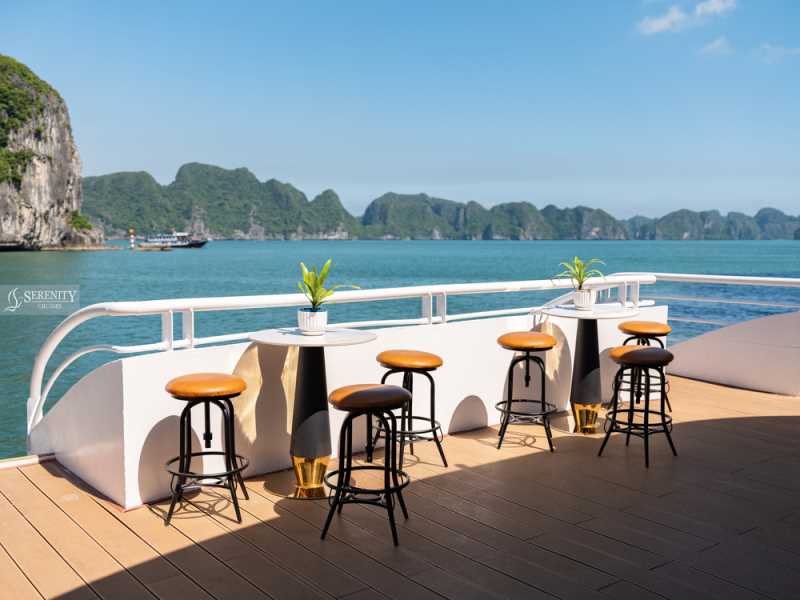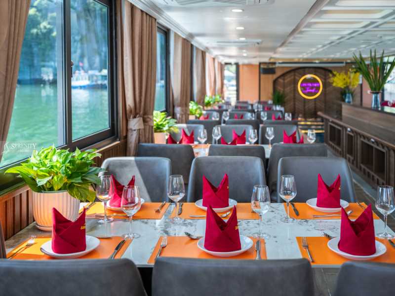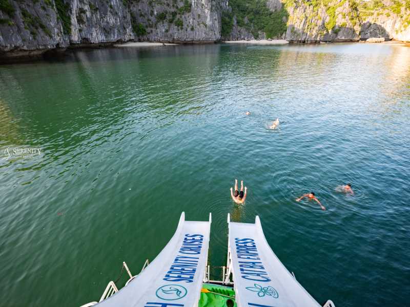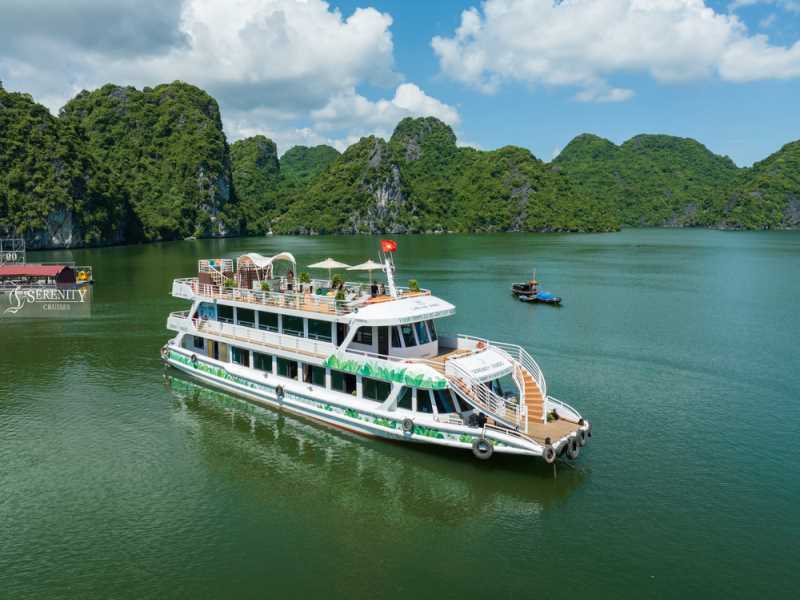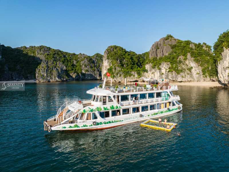 Serenity Cruise offers a unique and peaceful escape through the breathtaking scenery of Cat Ba Island and Lan Ha Bay, with a design inspired by the tranquil harmony of nature. Serenity Cruise features premium amenities including a high-end restaurant, a fun water slide from the top deck, and a scenic sundeck for sunset parties. Your journey includes an authentic visit to the ancient Viet Hai Village, followed by exciting activities like kayaking and swimming in the crystal-clear emerald waters.