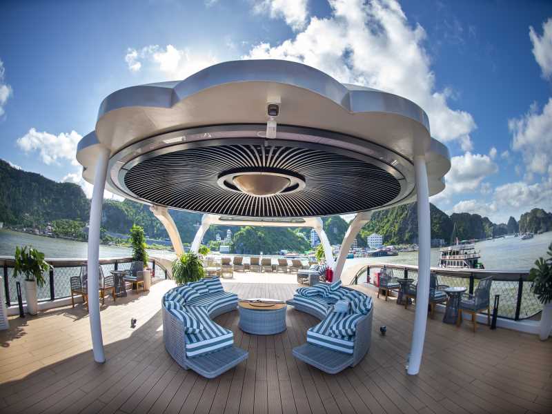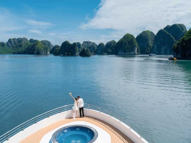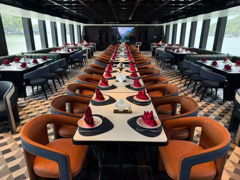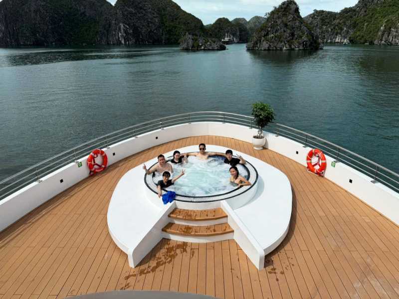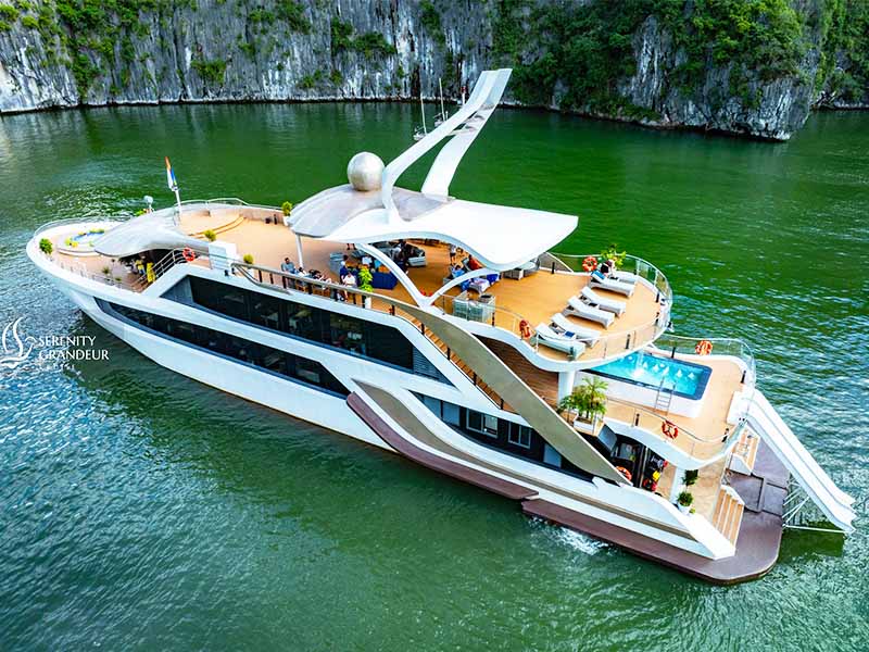 Serenity Grandeur Cruise is a 6-star masterpiece inspired by a "Precious Pearl," offering a modern European-style escape across the pristine waters of Lan Ha Bay. This elite day cruise features a panoramic swimming pool, the bay’s longest water slide, and a luxury rooftop bar for ultimate entertainment. Guests will embark on an adventurous 1D journey to Cat Ba Island, exploring the ancient Viet Hai Village by bicycle and enjoying the exhilarating aquatic activities in the heart of the heritage site.