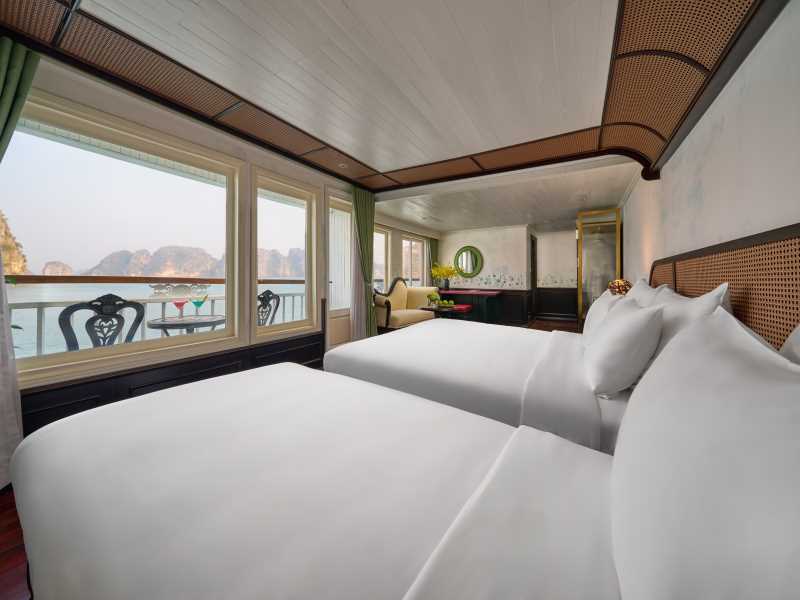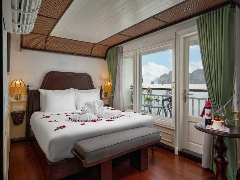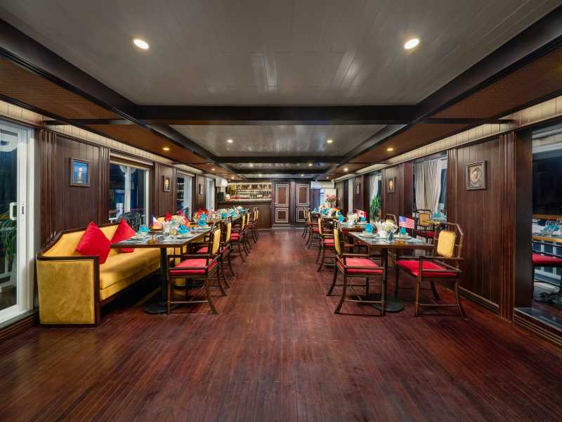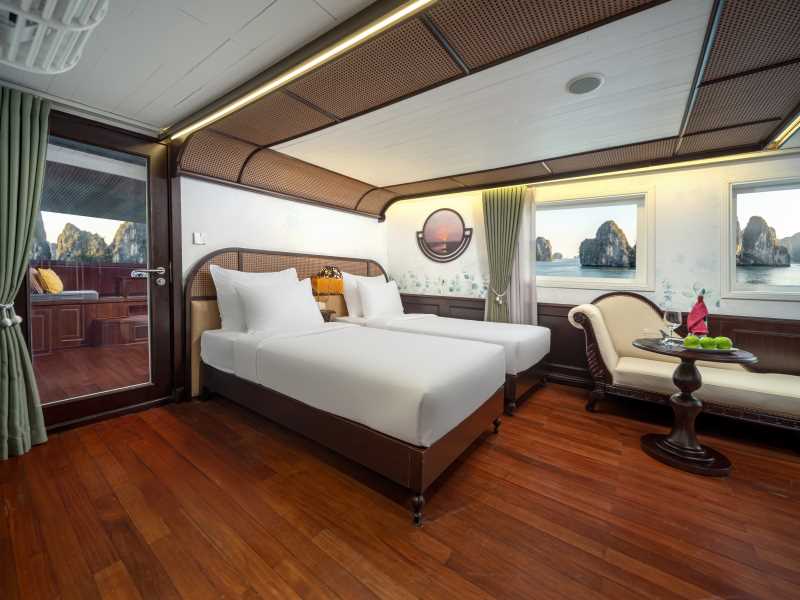 Signature Royal Cruise redefines elegance in the quiet waters of Bai Tu Long Bay, offering an intimate escape with just 15 luxurious cabins designed in a romantic European wooden style. Recently refreshed in 2024, this 4-deck vessel features private jacuzzi bathtubs in every room, a soothing spa, and a classic bar for a truly royal experience. Your 3D2N voyage explores the bay's hidden gems, from the peaceful Vung Vieng Floating Village and the scenic Cong Do Area to the magnificent stalactites of Thien Canh Son Cave.