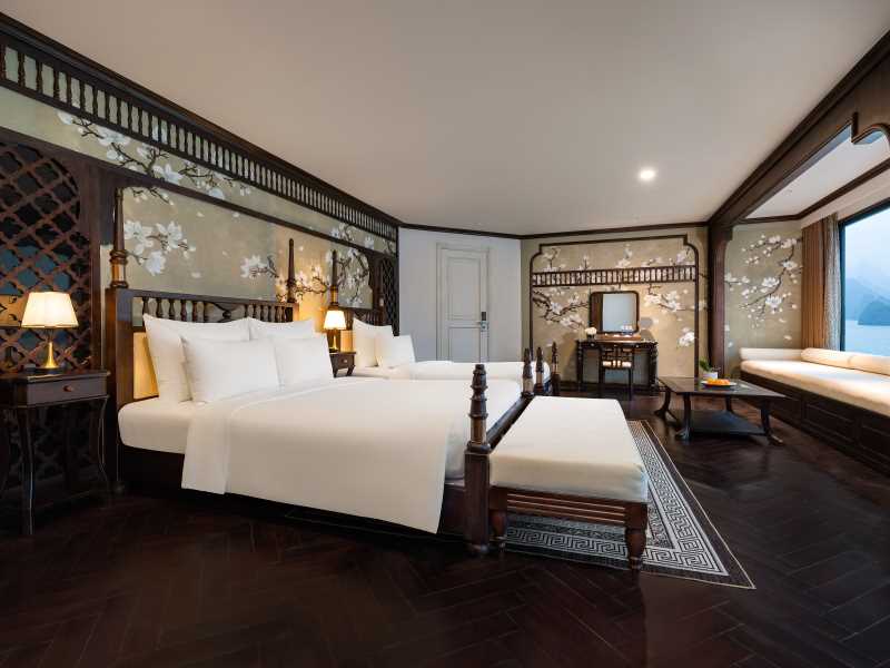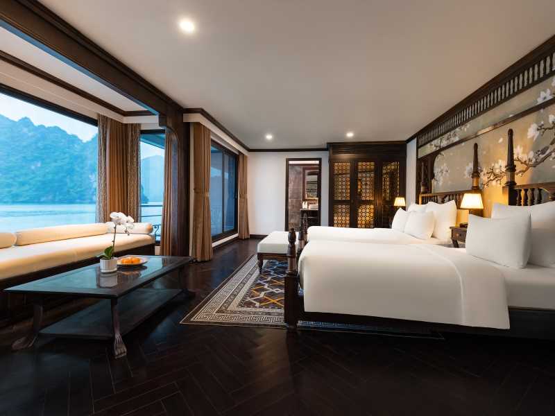 Venus Cruise features an elegant neoclassical design, providing a boutique and sophisticated retreat across Halong Bay & Lan Ha Bay. This premium vessel offers high-end facilities, including a mini pool, a professional spa, and a panoramic sky bar. The 3D2N itinerary takes you on a deep exploration of the mystical Dark and Bright Cave, the tranquil Tra Bau Area, the ancient Viet Hai Village, and the pristine Van Boi Beach.